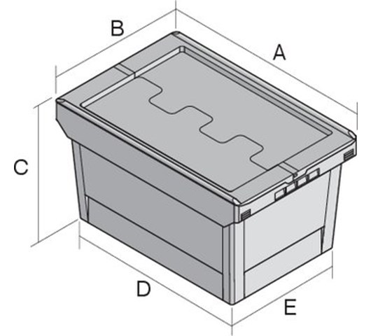 | Tip | Boja | Nosivost | Naslagana nosivost | Volumen | Vanjske dimenzije | Unutarnje dimenzije | Komada / pak | Ref broj | |